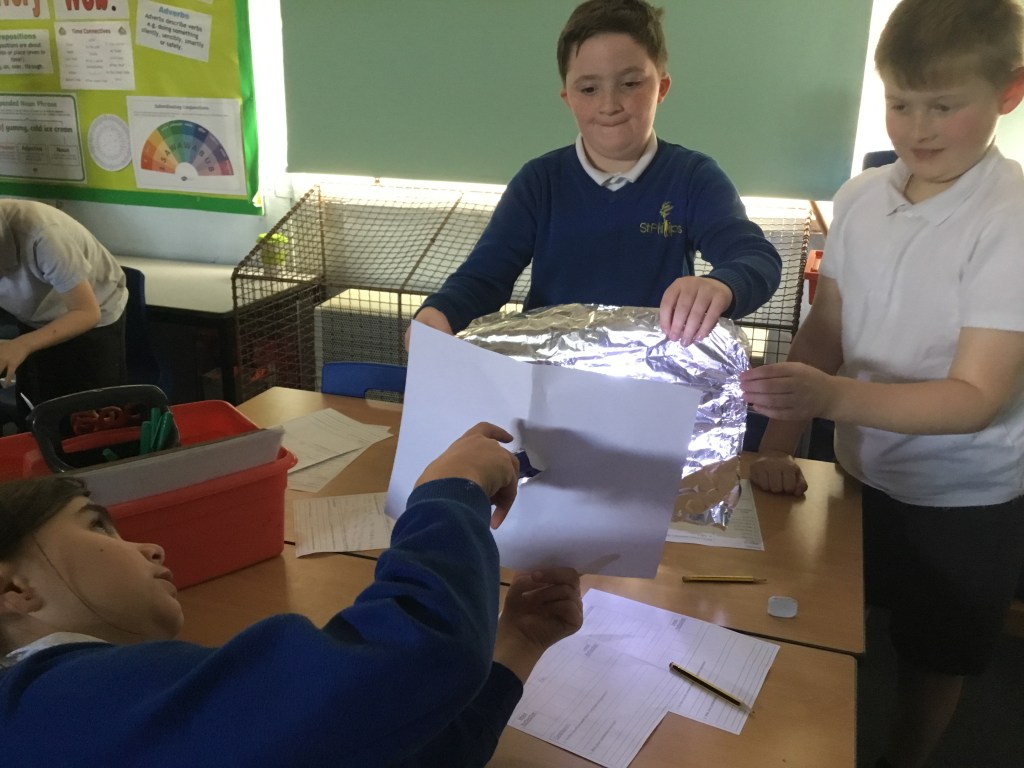 Today, Eagle Class were testing different materials to see which ones were the best reflectors of light. The DVD and high vis jacket seemed to be the most successful for most groups, with the black card being the least reflective. The children will use their findings to help them next week when they design and make a reflective band to wear when travelling to school to keep them safe.